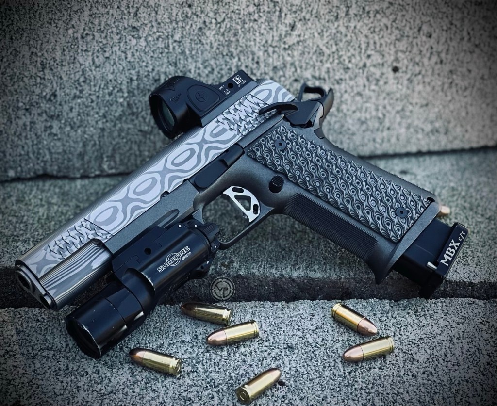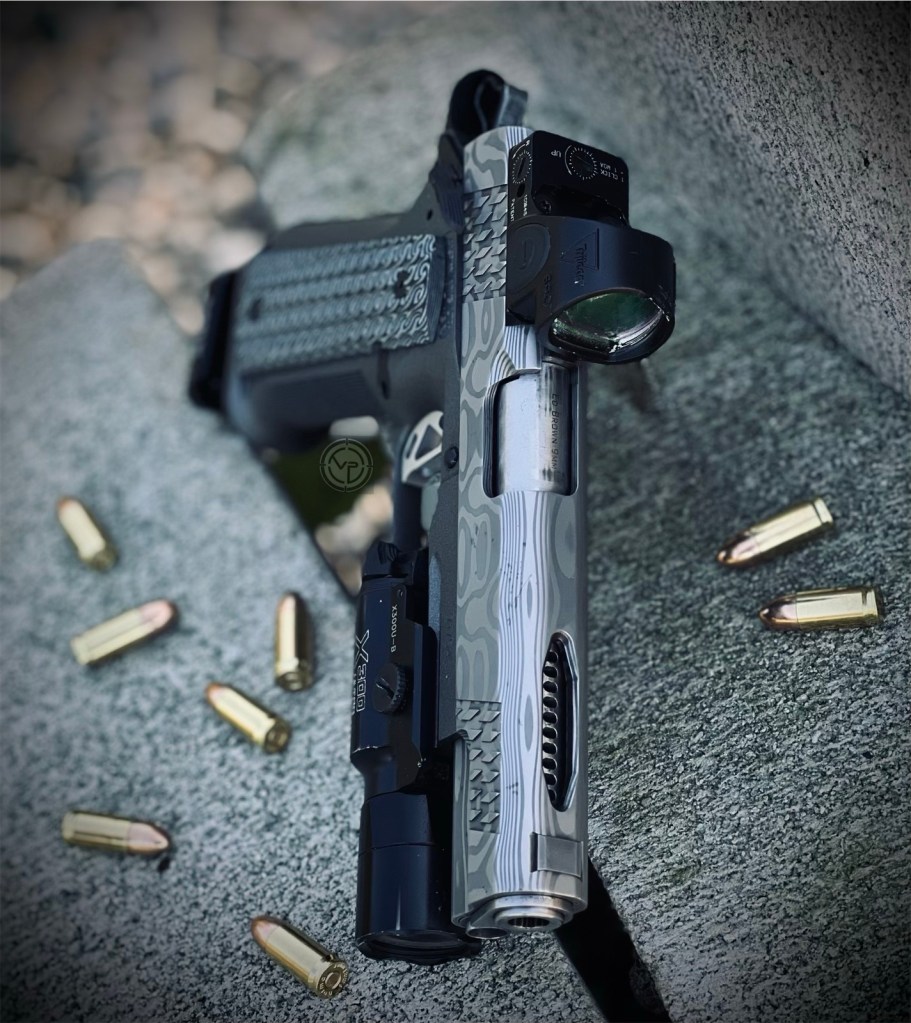 Built on a Caspian H.C. frame featuring an integral construction with modified VZ Grips G10 Hydra grips and paired it with a 5” Damascus 9mm slide along with a match grade barrel all tuned to tactical match setup.