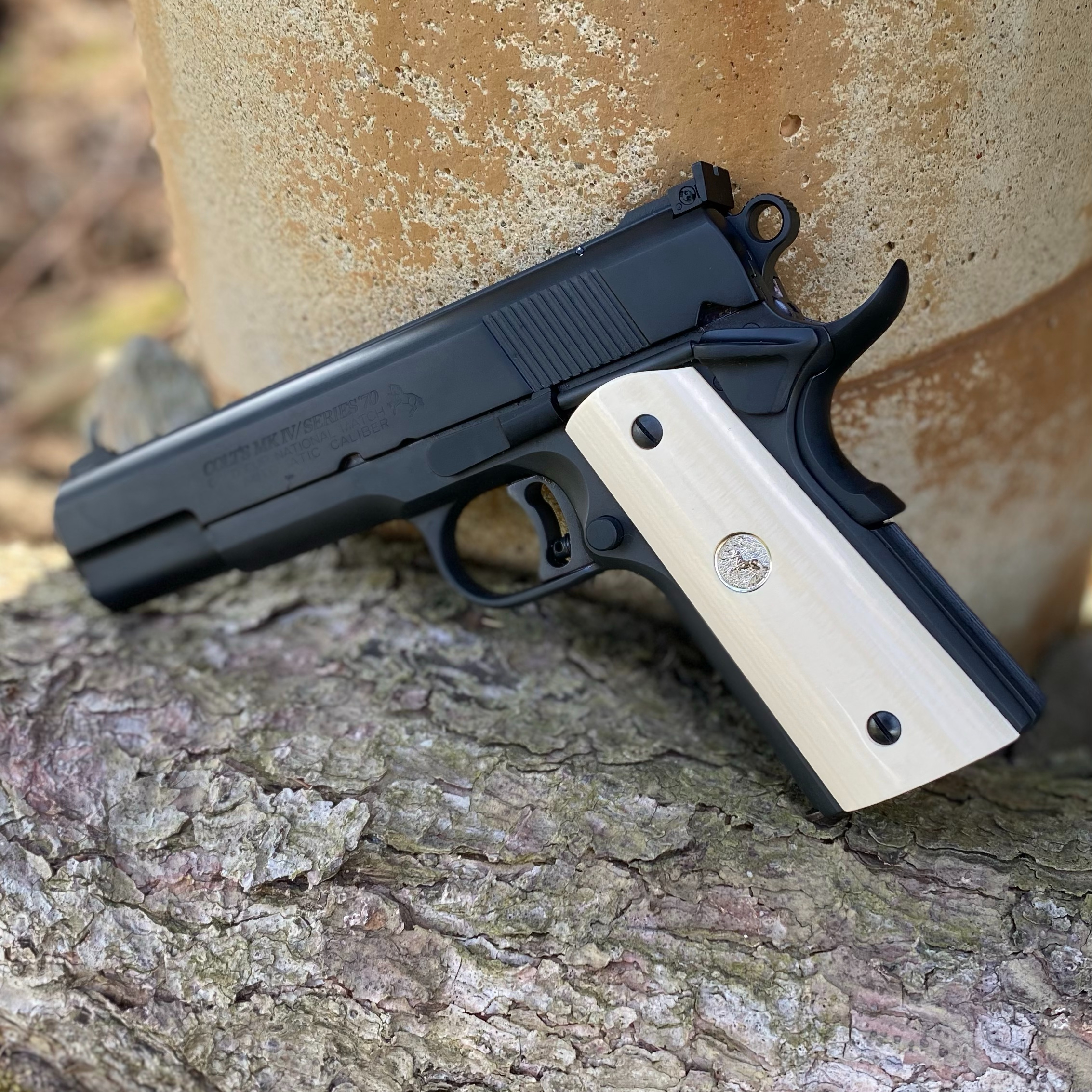 Finishing touches are not complete without a Heinie gold dot front sight and ivory grips paired with a fresh park/blue finish.