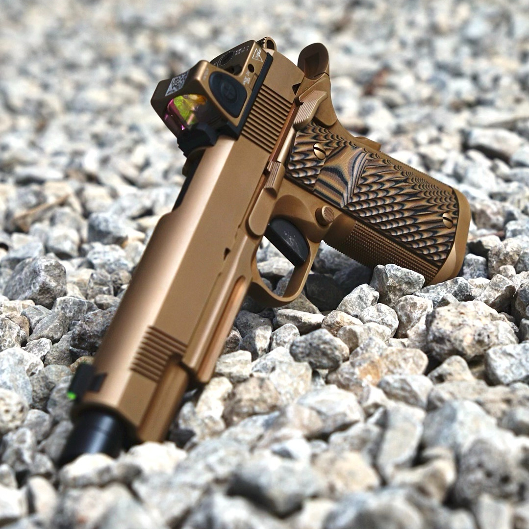 M45A2 45ACPA concept project fueling the imagination, the next MEUSOC/M45 variant…This build features a Caspian Arms frame/slide recon setup. Paired with a Barsto Precision threaded bull barrel 45ACP and Dawson Precision recoil system, all tuned to a tactical match setup. The frame was modified at Graff Customfor the Stan Chen Customs Gen 2 MSH/Magwell setting up the frame with wrap around checkering and VZ Grips, the King of G-10 grips. grips. The slide was modified by Buhler Ballistics for a Chamber Customs optic plate with a Trijicon, Inc. RMR. The controls/internals along with the ignition system from Evolution Gunworks are all hand fitted and precisely tuned with a short roll 4lb break. Finishing up the project with external blending, heavy edge radius and refinished with IonBond FDE and black accent pieces. Masterpiece.