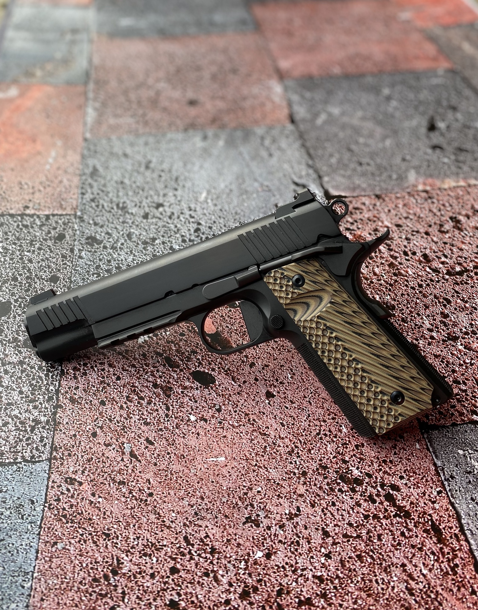 This particular build features slim ambi safeties, knuckle cut grip safety, ring hammer ignition system, slim VZ grips and a matte black DLC finish.