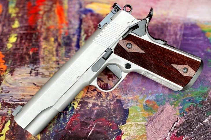Valor Precision Rebuild on a Ruger 1911 10MM featuring a stainless frame/slide. Paired with matte black components and double diamond checkered grip panels.