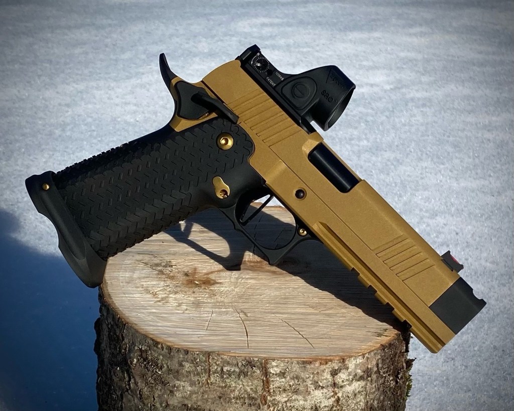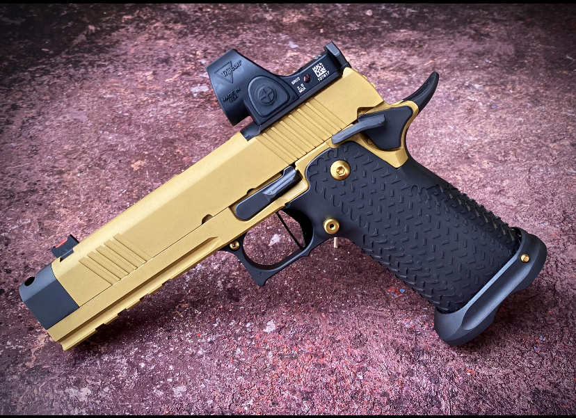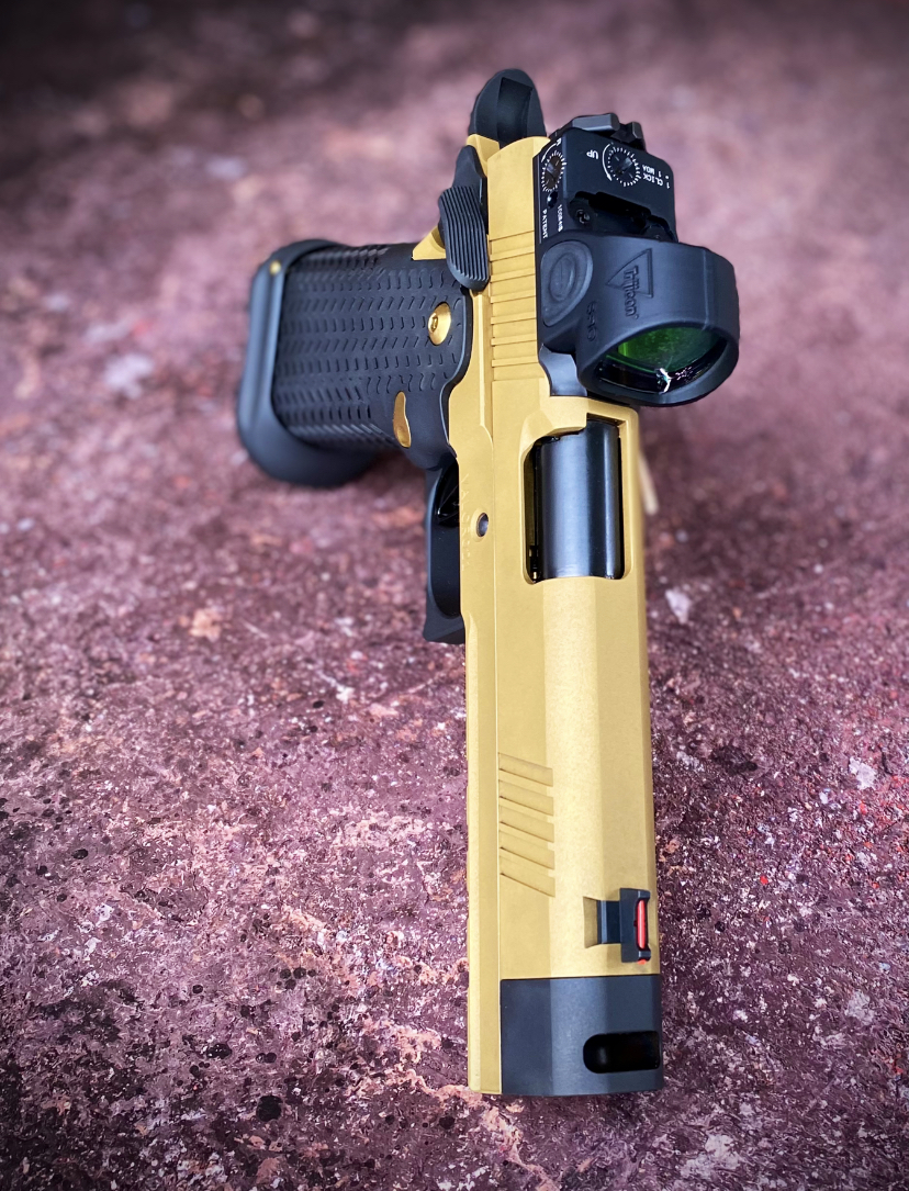 This build consist of a compensated VP 2011 featuring a matte gold TiN externals surface with polished critical internal surfaces and black DLC.