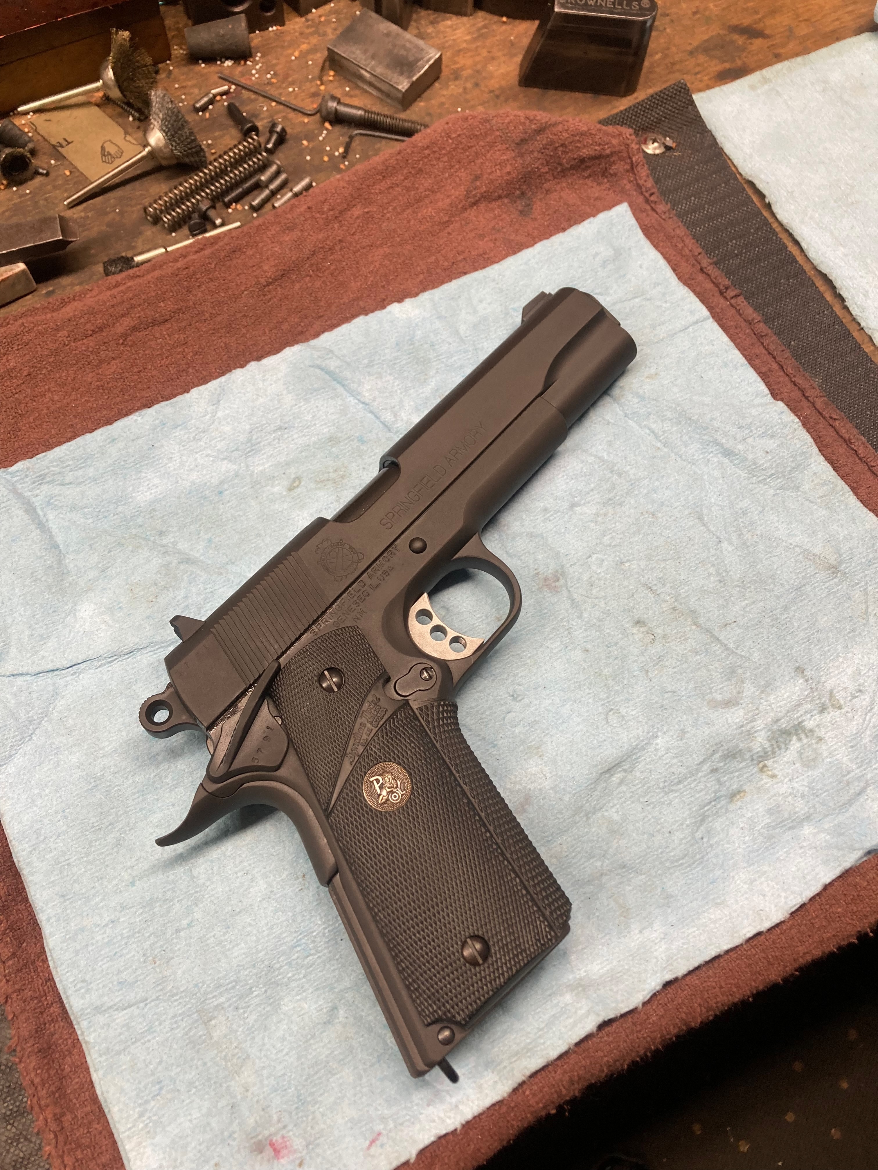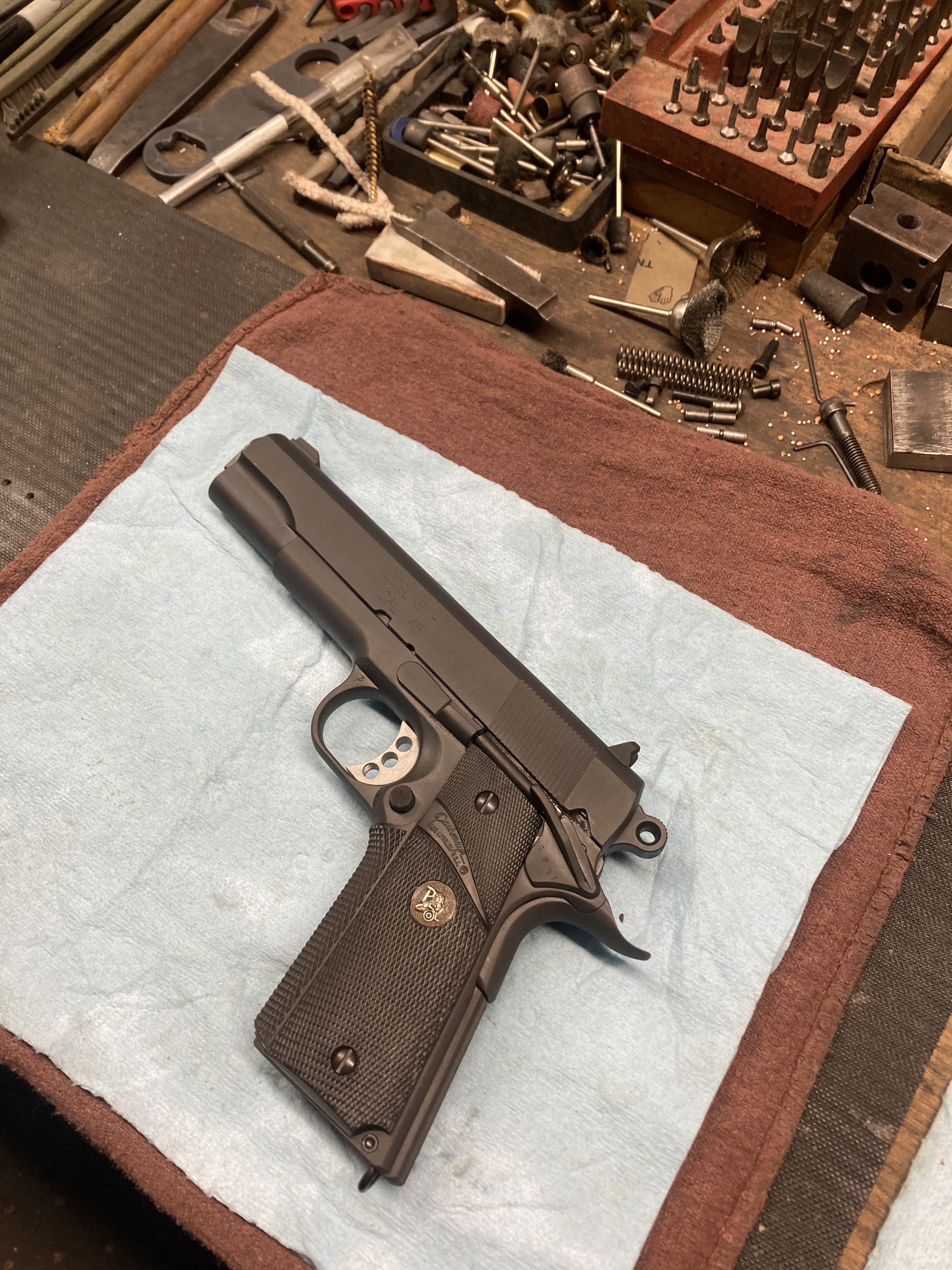 This project involved a complete rebuild of an SA Government .45, utilizing only the original frame and slide. Through meticulous hand-fitting and precise tuning of all new components, this war horse was brought back to life. We completed this build with a manganese phosphate (Parkerizing) finish that compliments its beauty while ensuring durability.