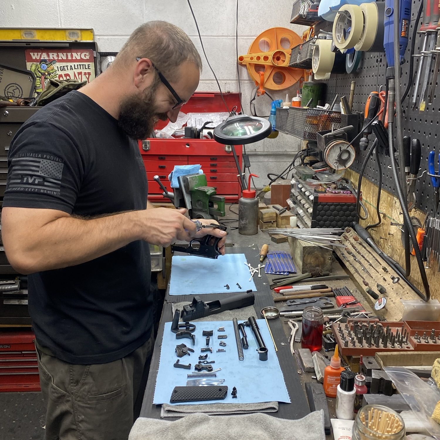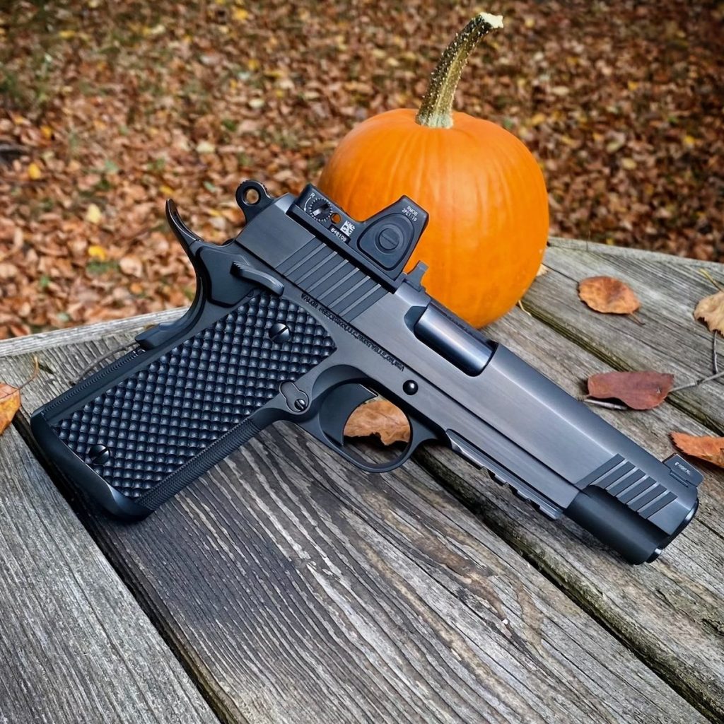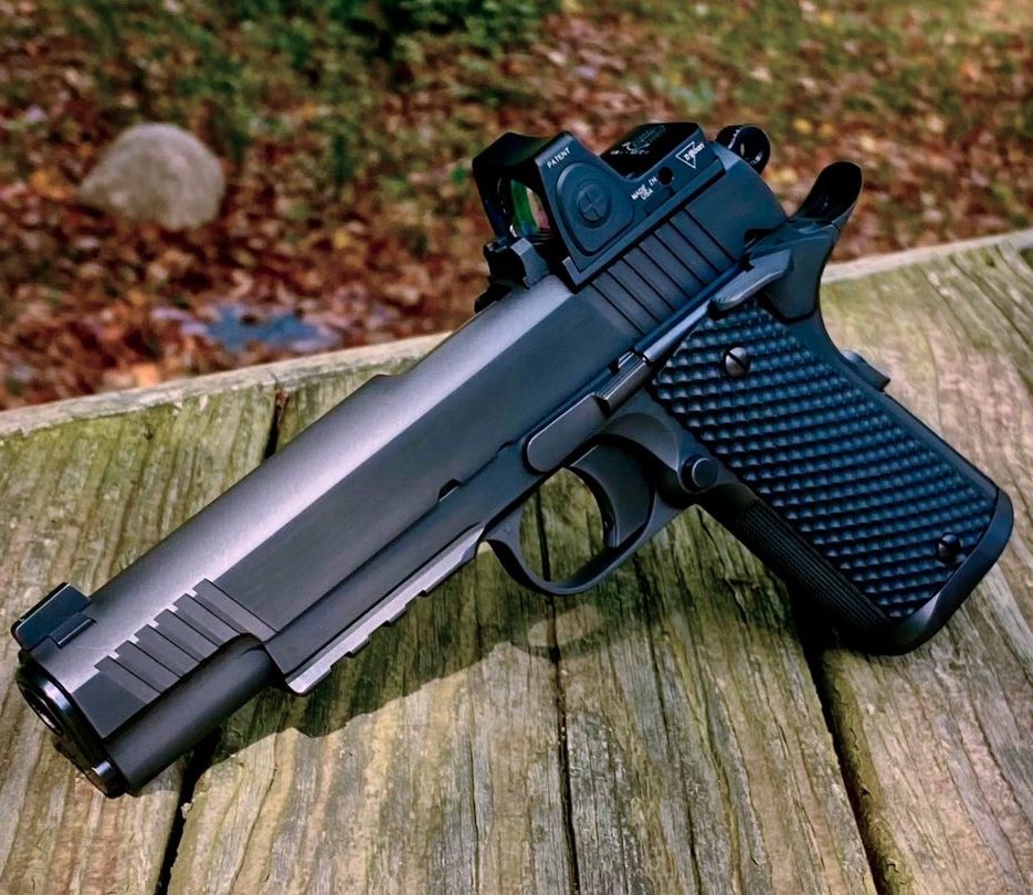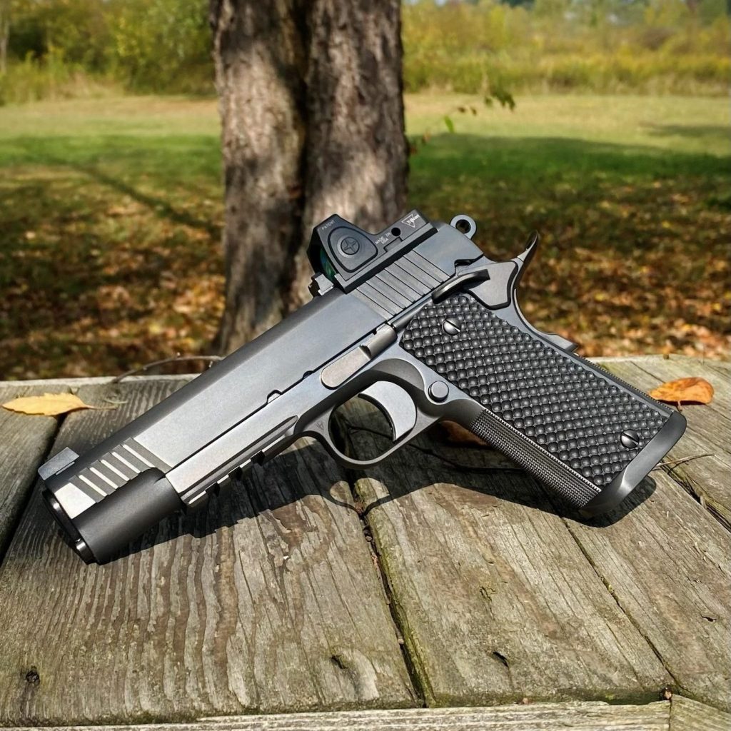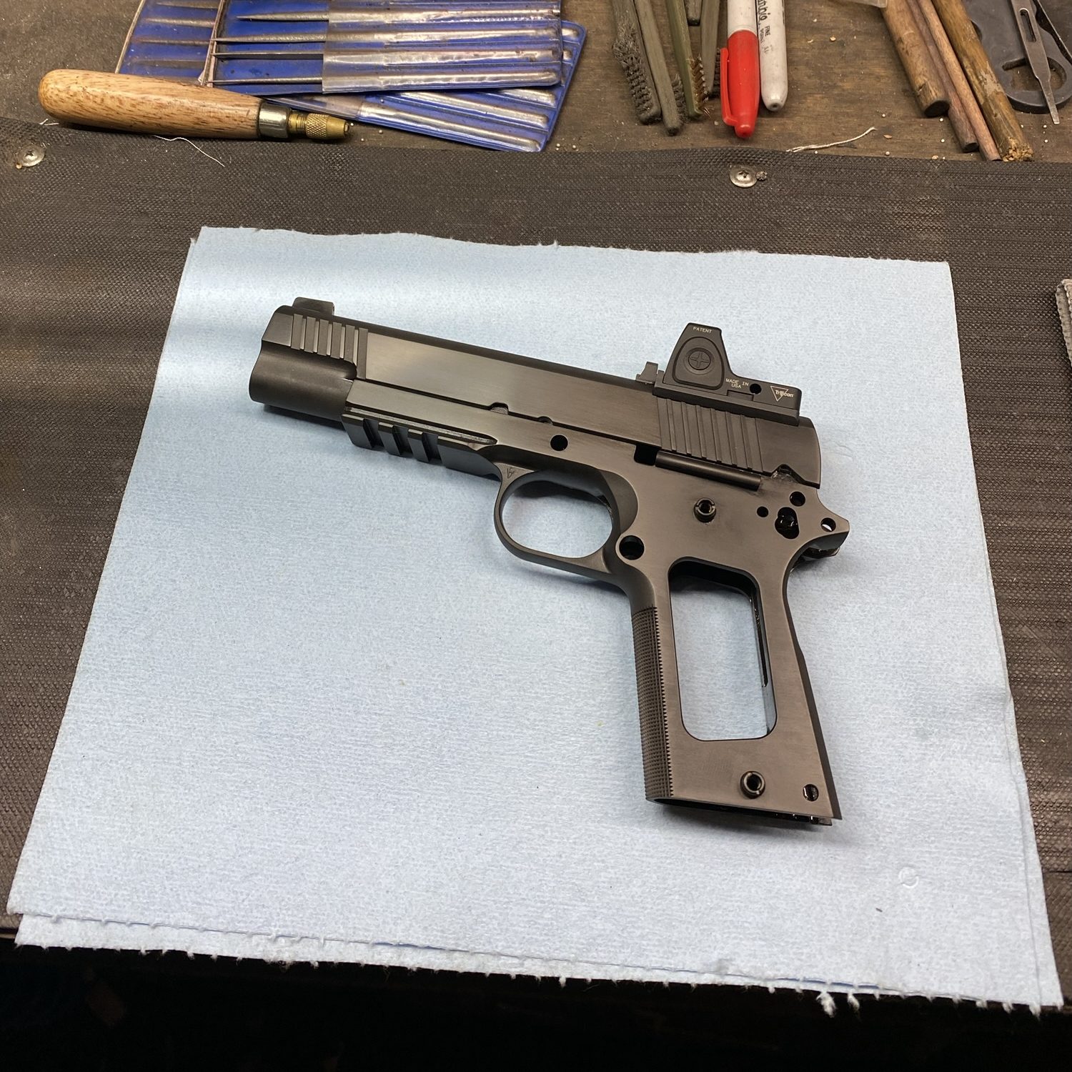 This project features a JEM/Valor frame & slide, mated with a Kart NM barrel in a “tactical match” setup. Sights upgraded to a Chambers RDSM optic plate setup w/ buis and a Trijicon RMR. Frame is configured with 25lpi front strap, a 25lpi StanChen Gen 2 (frame mod) MSH/magwell one-piece, and paired with VZ G10 Gunner grips.
