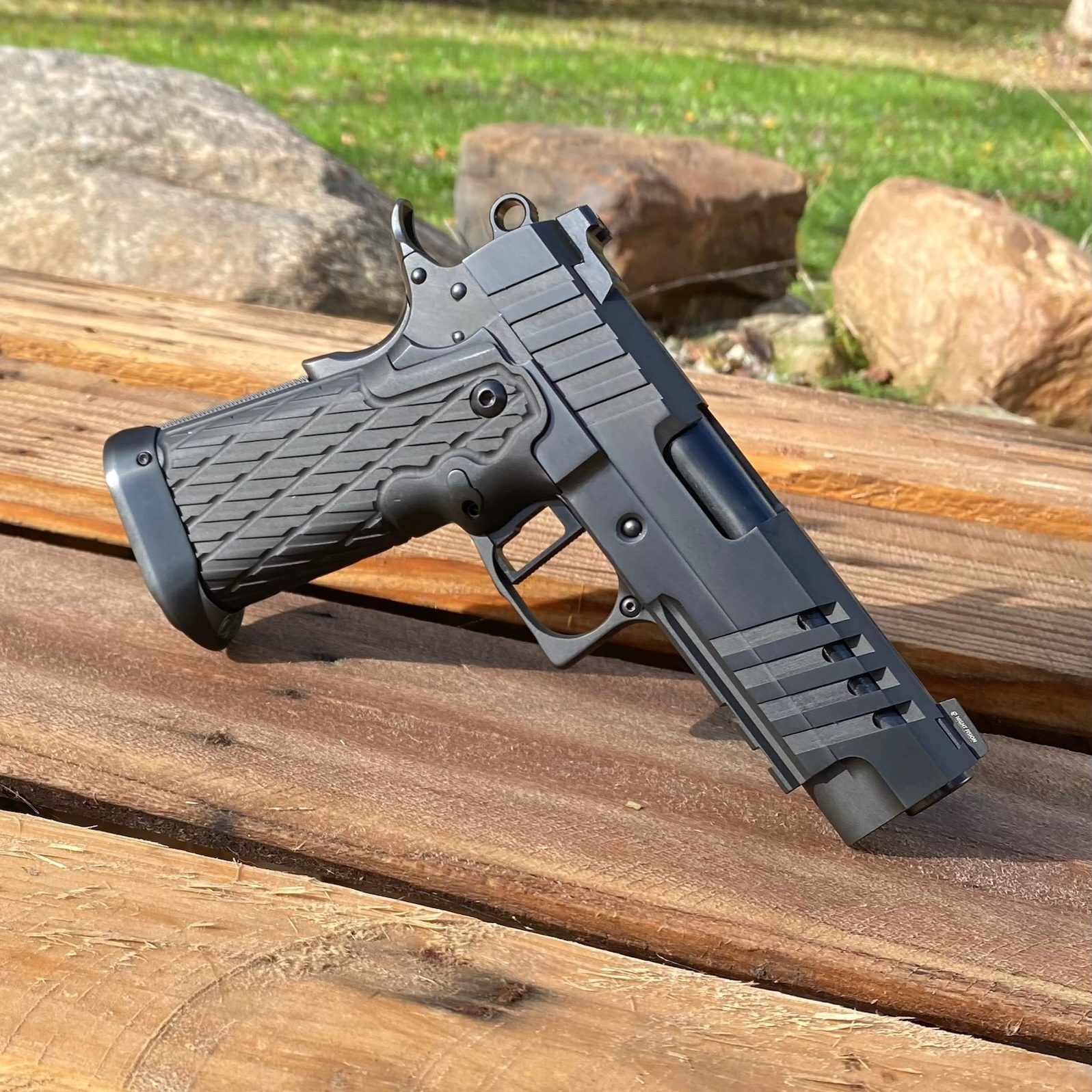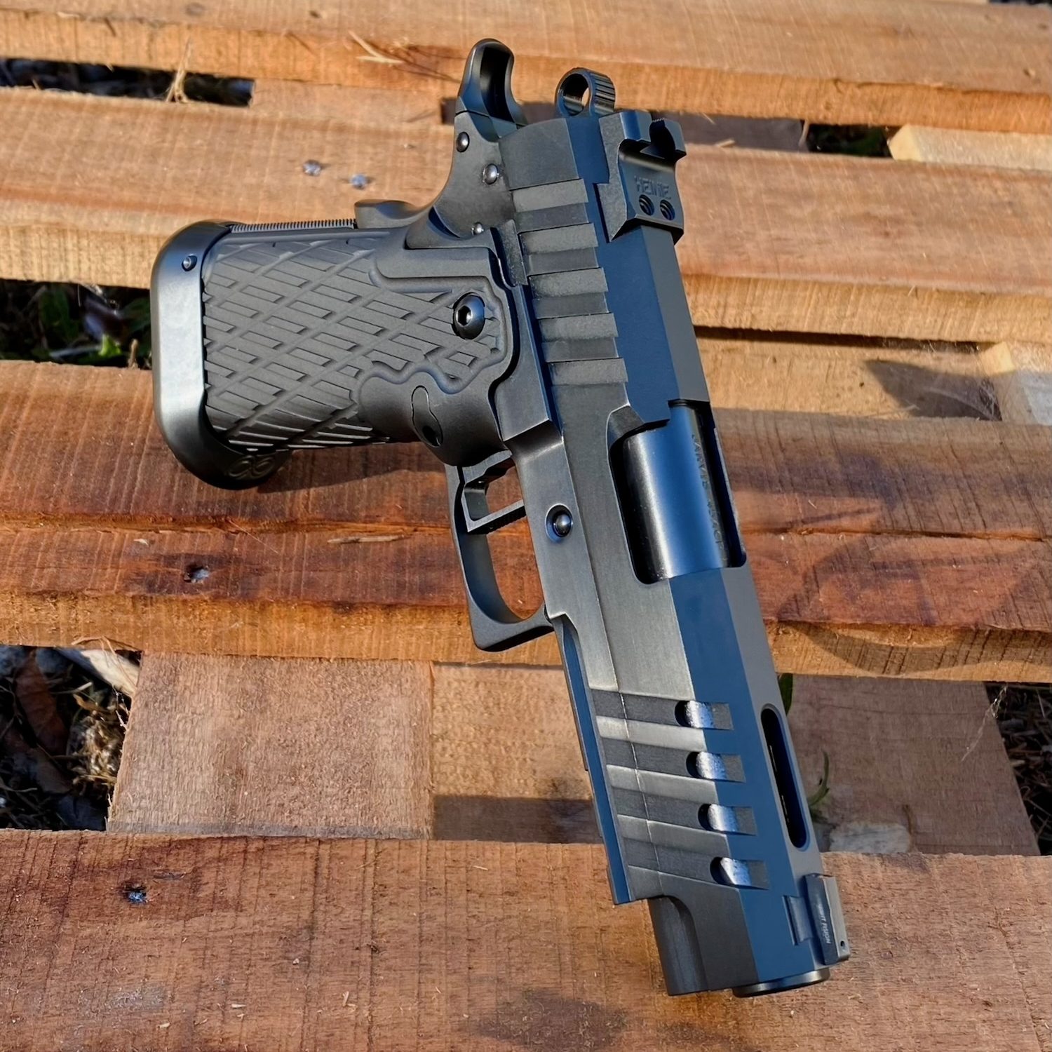 This custom Valor Precision 2011 Commander in .45 ACP features hand-fitted and precisely tuned internals with polished surfaces for smooth, reliable performance. Finished in a matte/polish two-tone black DLC coating, it includes custom slide serrations and a ported barrel.
